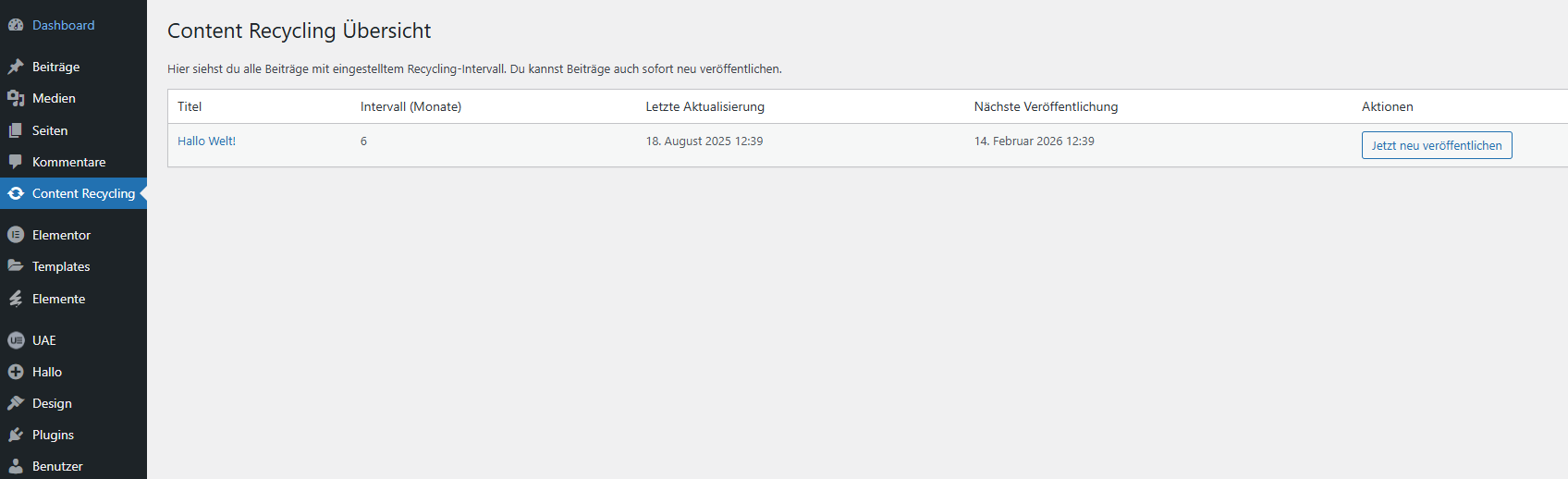Im WordPress-Dashboard behältst du jederzeit den Überblick über alle recycelten Beiträge, inklusive des eingestellten Intervalls und des nächsten geplanten Veröffentlichungsdatums. Zusätzlich hast du die Möglichkeit, Inhalte manuell per Klick neu zu veröffentlichen – ideal für spontane Reichweiten-Booster oder gezielte Kampagnen.