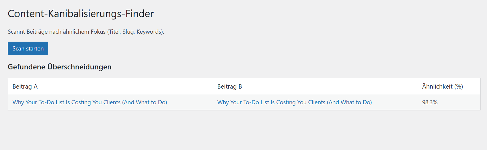 Der Content-Kanibalisierungs-Finder erkennt automatisch Beiträge mit gleichem oder sehr ähnlichem Fokus – basierend auf Titel, Slug und Inhalt. So siehst du sofort, welche URLs sich gegenseitig Rankings stehlen.