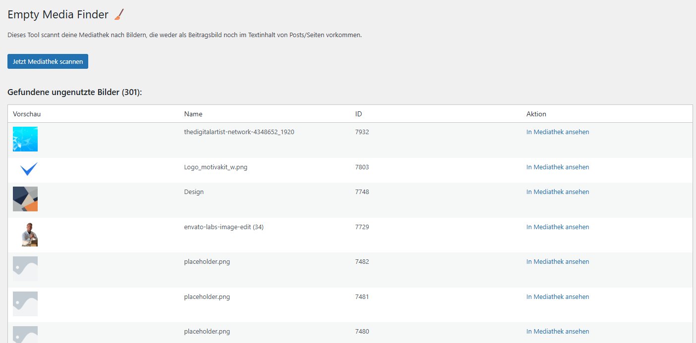 Da diese Bilder technisch gesehen nicht im Standard-Textfeld von WordPress stehen, könnten sie vom Scan als „ungenutzt“ markiert werden, obwohl sie Teil eines schicken Layout-Moduls sind.