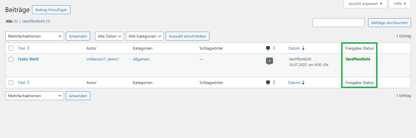 Übersicht im Backend: Zusätzliche Statusspalte in der Beitragsliste zeigt sofort, welche Beiträge noch geprüft werden müssen.