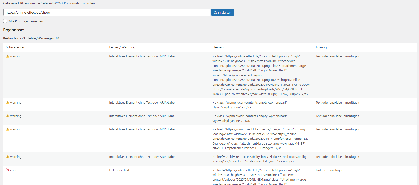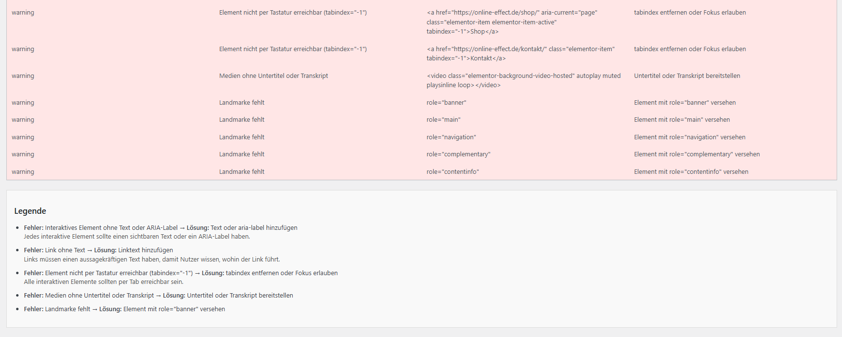 Legende: Jede Warnung und jeder Fehler wird verständlich erklärt – inklusive Lösungsvorschlag und WCAG-Verweis.