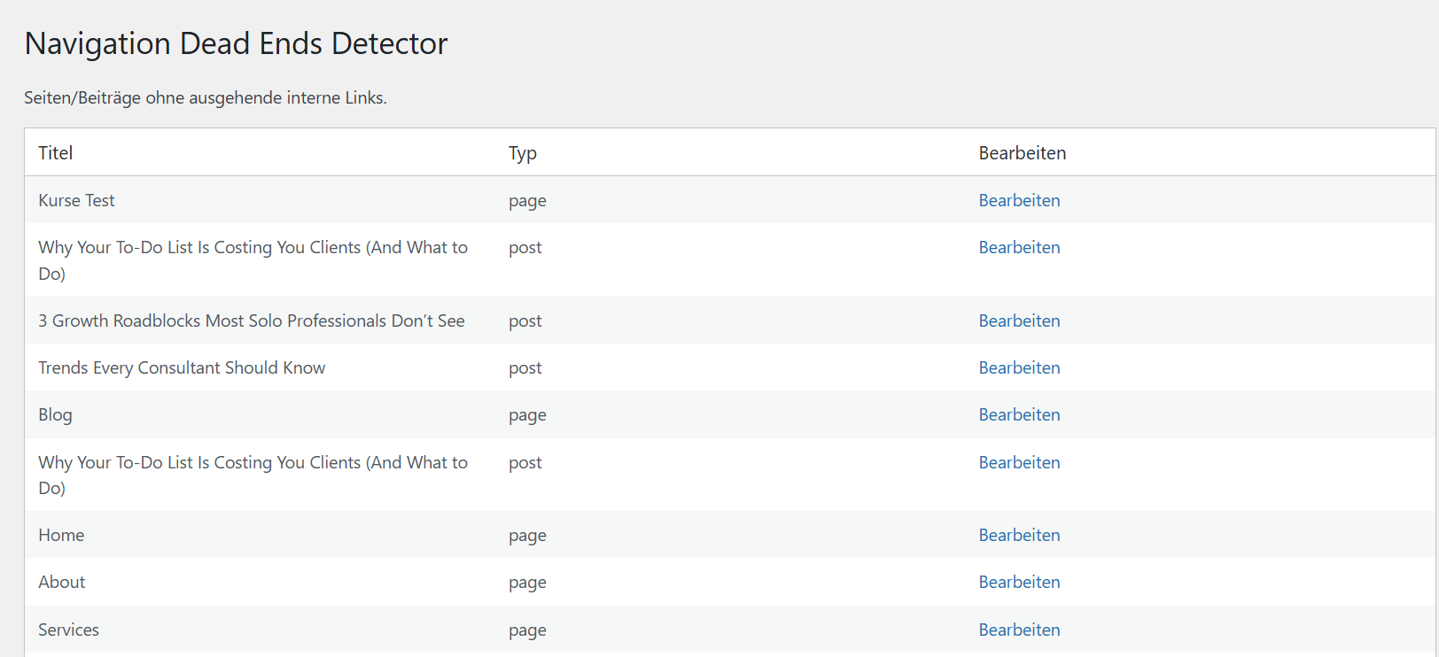 Mit dem Navigation Dead Ends Detector erkennst du sofort alle Seiten und Beiträge ohne ausgehende interne Links. So kannst du gezielt die Navigation verbessern, die Nutzerführung optimieren und den SEO-Wert deiner Website steigern.