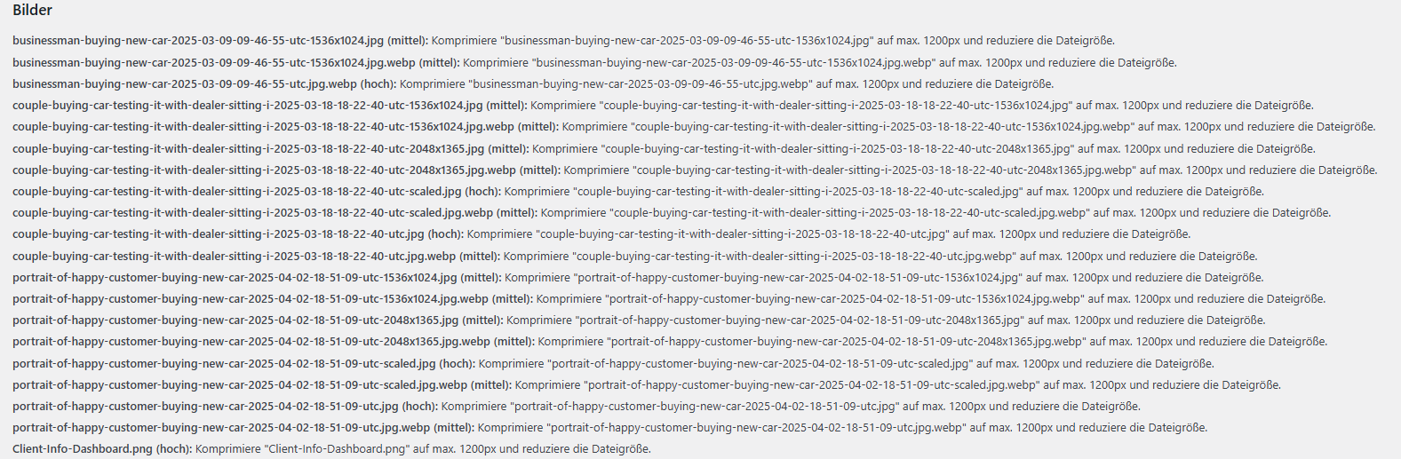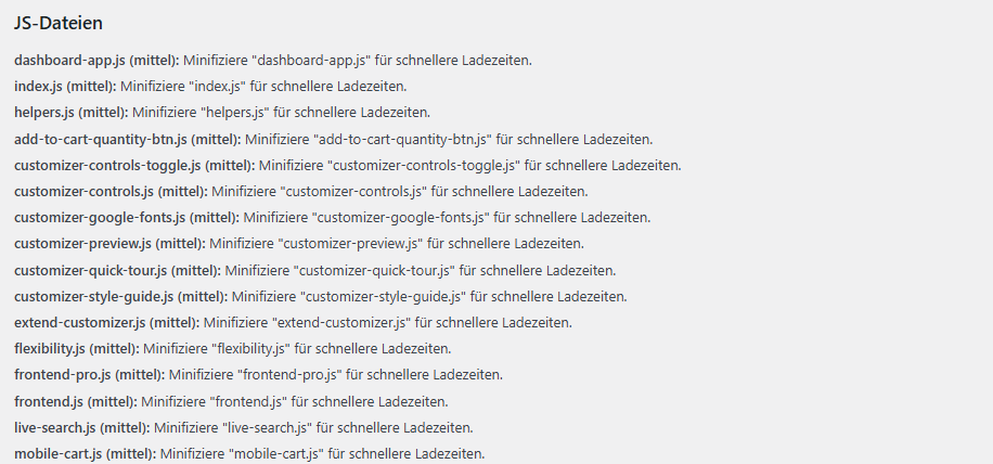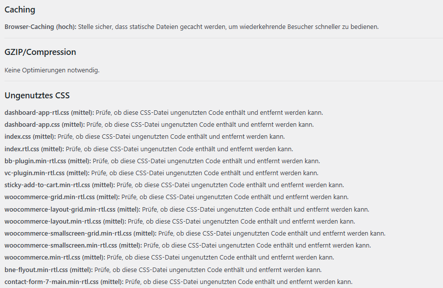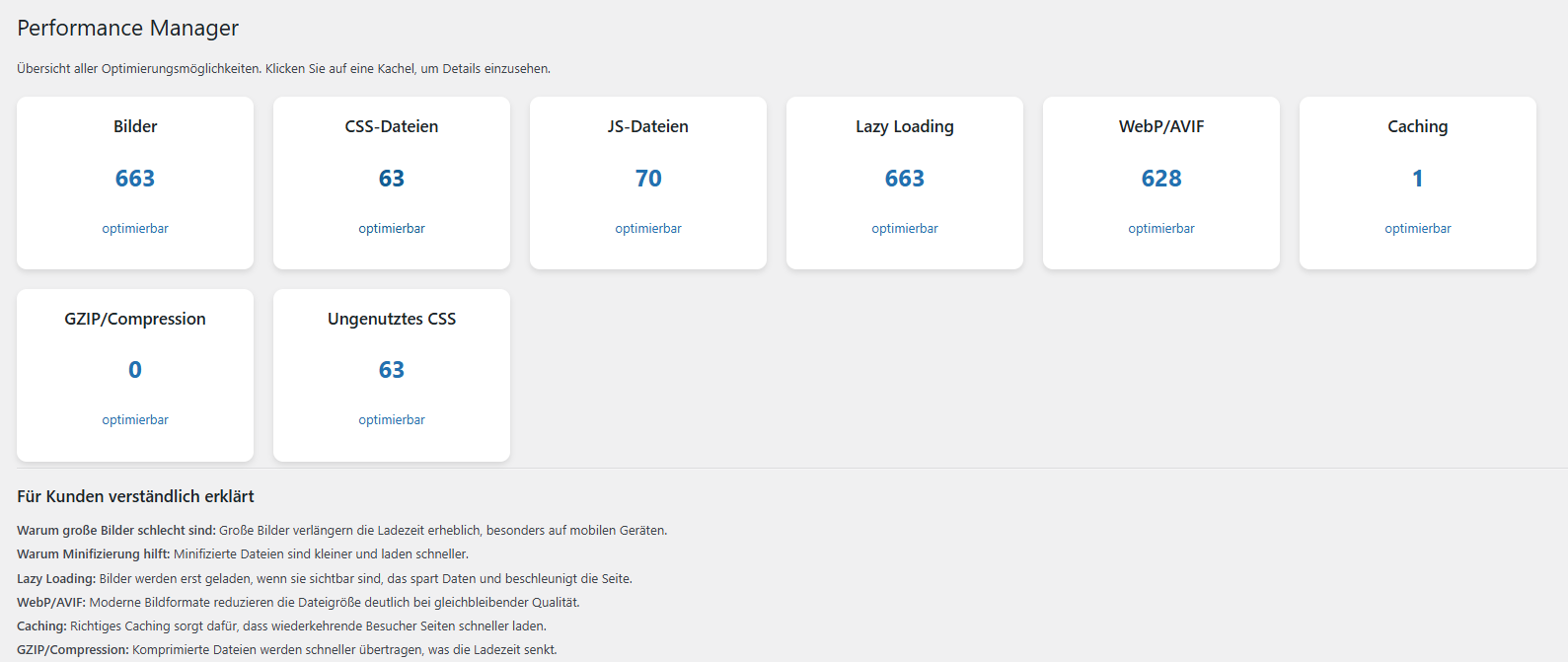 Mit dem Performance Manager Pro bekommst du keine klassischen PageSpeed-Werte, sondern konkrete, umsetzbare Empfehlungen. So weißt du genau, welche Schritte erforderlich sind, um die Ladezeiten deiner Seite zu reduzieren und die Performance nachhaltig zu steigern – von der Bildkompression über CSS- und JS-Minifizierung bis hin zu Caching- und Kompressionschecks.