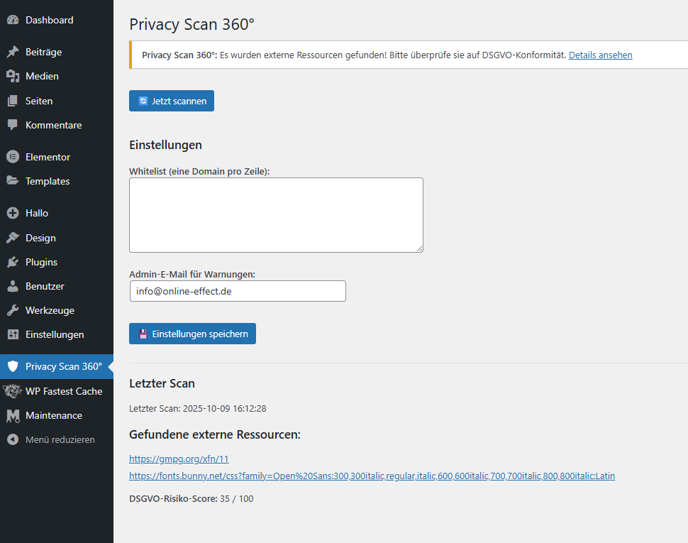 Privacy Scan 360° unterstützt dich dabei, mögliche Datenschutzrisiken zu erkennen und zu bewerten. Das Plugin ersetzt keine rechtliche Beratung.