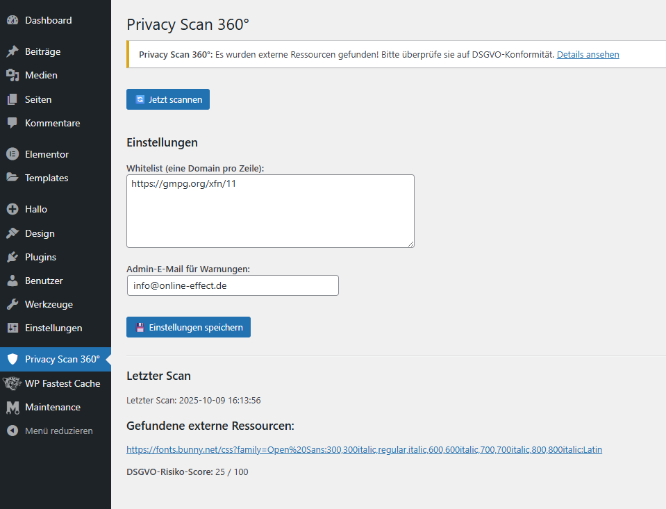 Mit Privacy Scan 360° hast du deine Website in Sachen Datenschutz immer im Blick. Das Plugin erkennt neue externe Einbindungen, bewertet automatisch deren Risiko und informiert dich sofort. So bleibst du jederzeit DSGVO-konform – ohne Aufwand, ohne Unsicherheit.