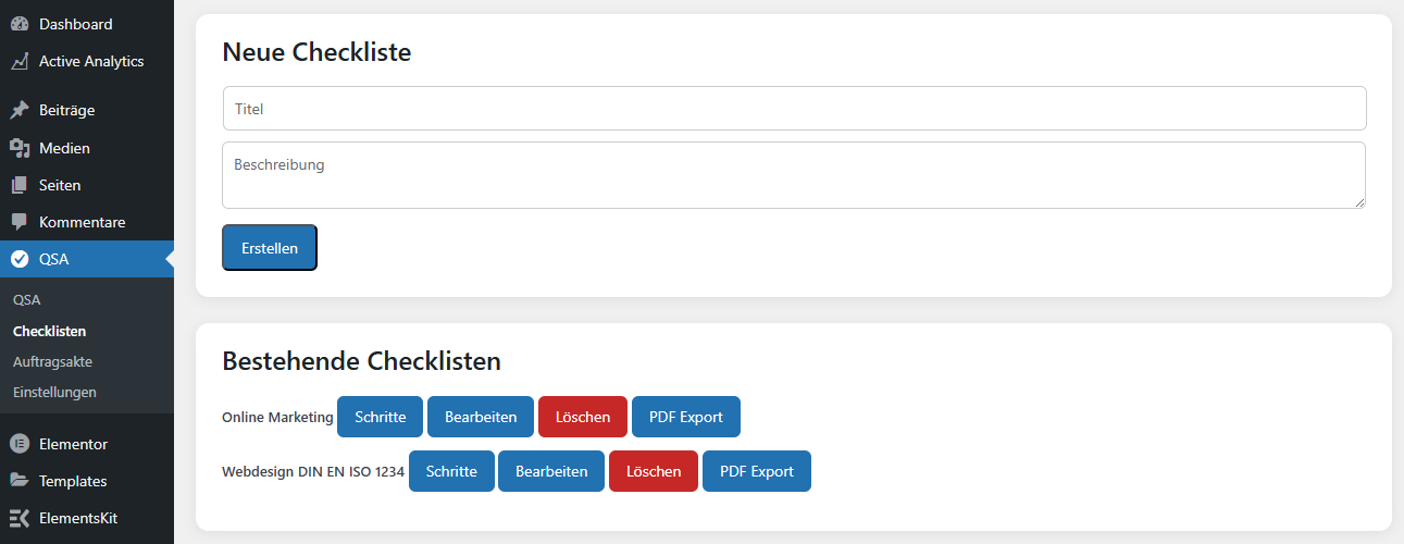 Der Qualitätssicherungs-Assistent (QSA) ist das ideale WordPress-Plugin für Unternehmen, die ihre internen Arbeitsprozesse standardisieren und effizient dokumentieren möchten. Speziell für Handwerksbetriebe, Industrieunternehmen und Dienstleister entwickelt, bietet QSA eine vollständig backendbasierte Lösung zur Erstellung, Verwaltung und Archivierung von Checklisten.