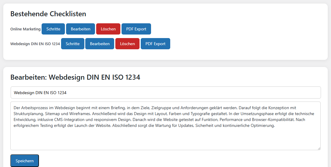Einfaches Management: Erstellen, bearbeiten und löschen Sie Checklisten und einzelne Schritte direkt im Backend. Der Export von Checklisten als PDF erfolgt per Klick, ohne zusätzliche Eingaben.