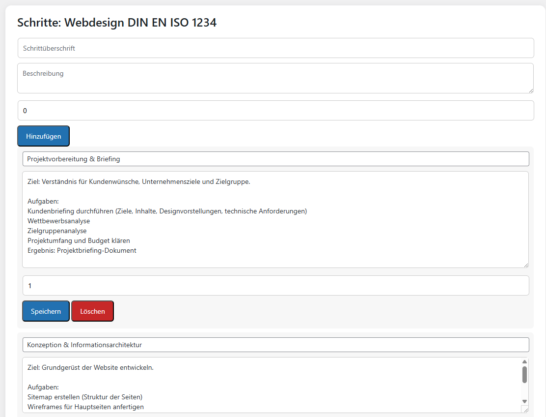 Backend-Checklisten: Legen Sie strukturierte Checklisten an, verwalten Sie einzelne Schritte mit Überschrift und Beschreibung, und ordnen Sie diese beliebig in der gewünschten Reihenfolge. Jeder Schritt ist flexibel bearbeitbar.