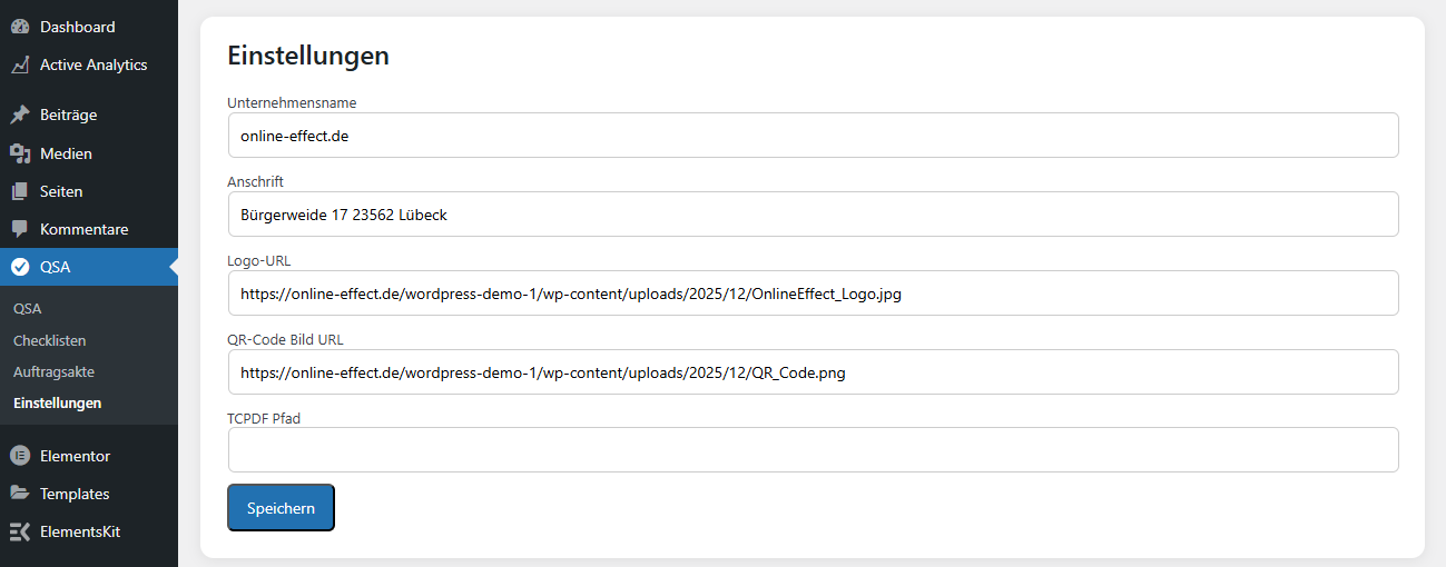 Einstellungen anpassbar: Hinterlegen Sie Ihr Unternehmenslogo, die Adresse, einen QR-Code und optional den Pfad zu TCPDF. Alle Einstellungen sind direkt im WordPress-Backend verfügbar, sodass Sie jederzeit Anpassungen vornehmen können.