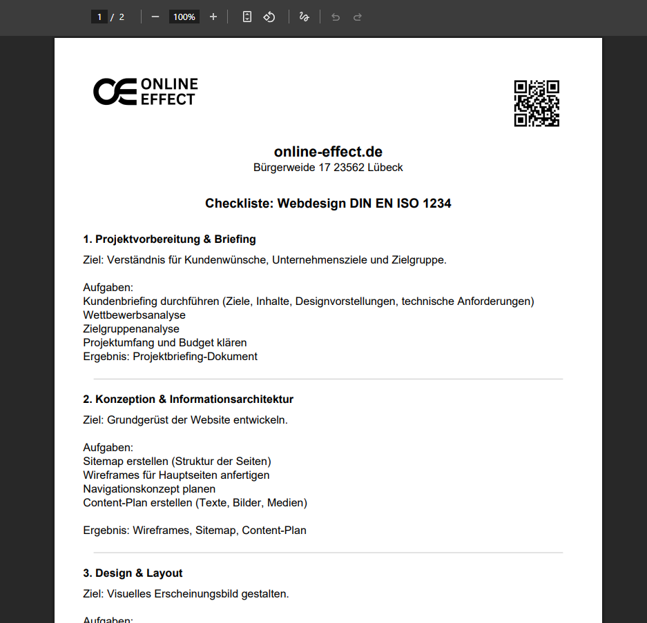 PDF-Export: Exportieren Sie jede Checkliste einzeln als professionelles PDF-Dokument. Mit individuellem Unternehmenslogo, Anschrift, Titel der Checkliste und hinterlegtem QR-Code-Bild. Die PDF-Dokumente sind übersichtlich strukturiert, mit klarer Trennung der Schritte, fett hervorgehobenen Überschriften und automatisch generierten Trennlinien.