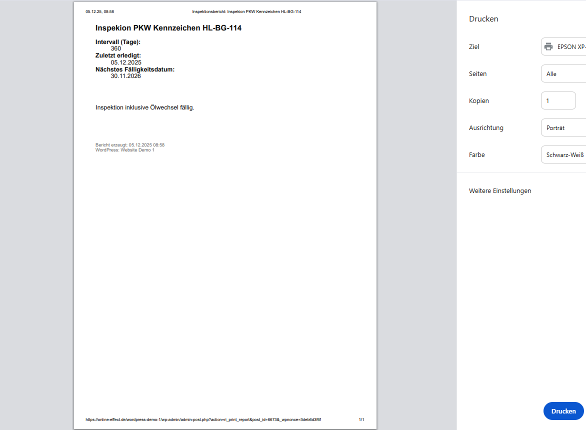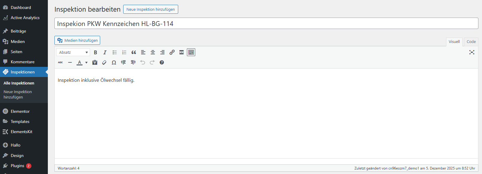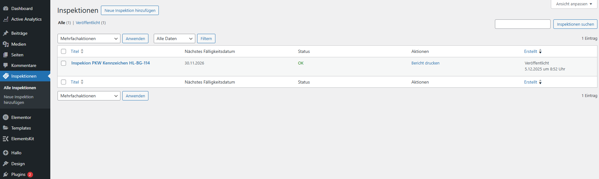 Unter Inspektionen neue Aufgaben anlegen, Intervall und „Zuletzt erledigt“ pflegen.