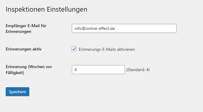 Unter Einstellungen → Inspektionen Empfänger-E-Mail und Erinnerungszeitraum konfigurieren.