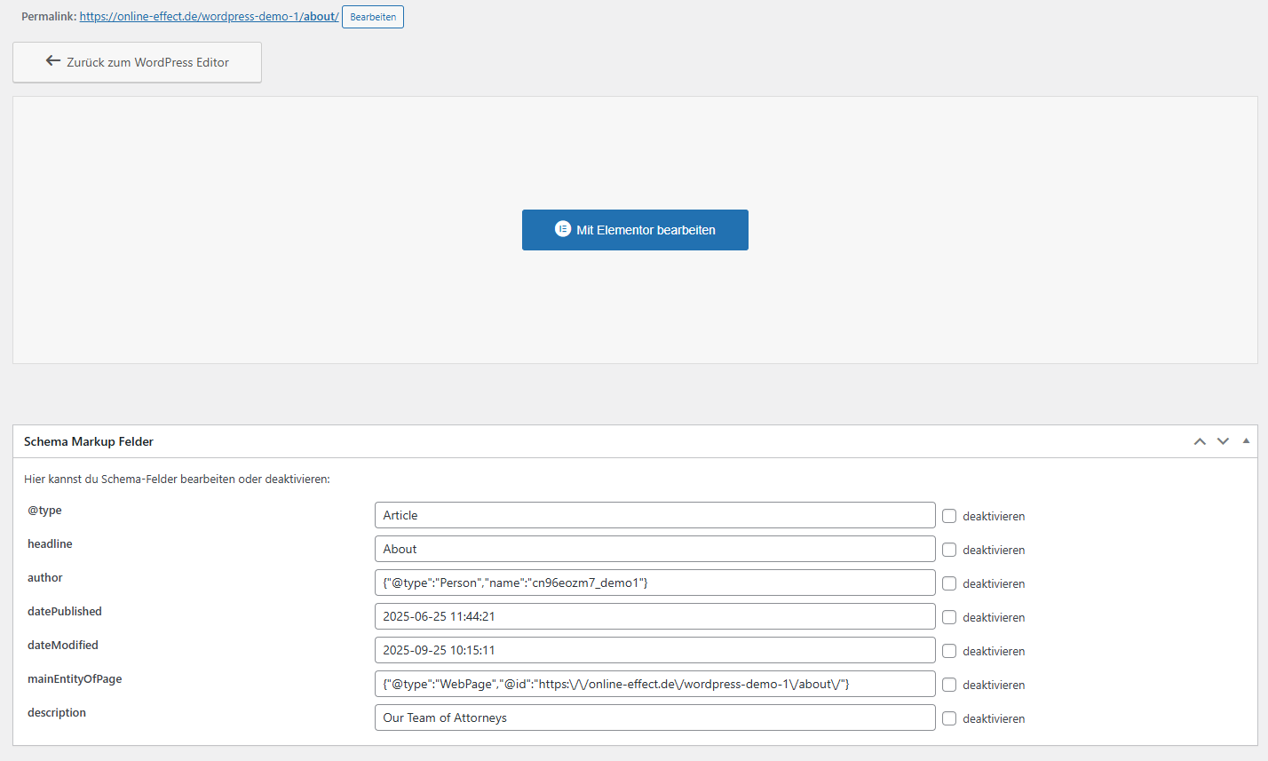 Bearbeite oder deaktiviere Schema-Felder direkt im Beitrag-Editor.