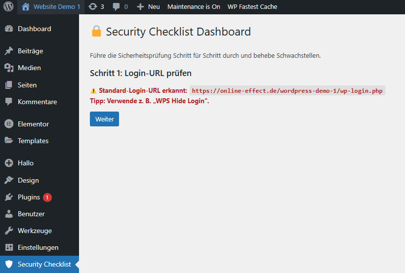 Prüfung der Login-URL: Erkennt, ob deine Seite noch die Standard-Login-Adresse verwendet, die leicht von Angreifern erraten werden kann.