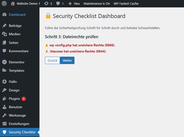 Kontrolle der Dateirechte: Analysiert zentrale Dateien wie wp-config.php und .htaccess auf zu weitgehende Berechtigungen.