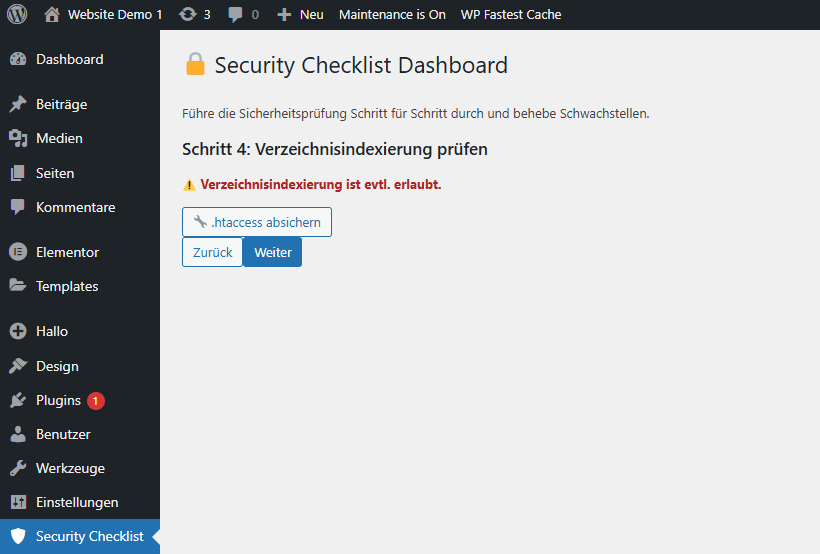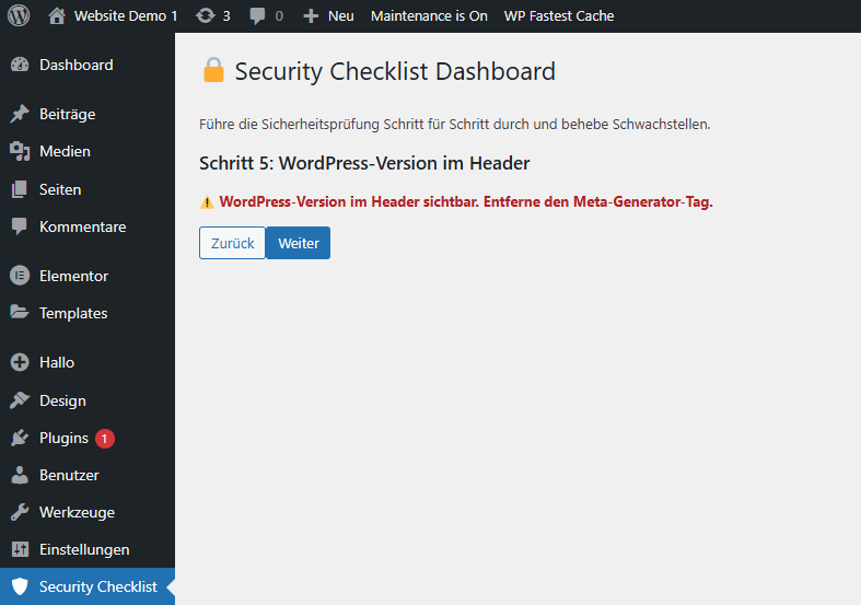 Anstatt eine endlose Liste technischer Warnungen anzuzeigen, führt dich das Plugin Schritt für Schritt durch alle relevanten Prüfungen. Jede Sicherheitsprüfung wird separat erläutert, damit du genau verstehst, warum sie wichtig ist und wie du sie verbessern kannst.
