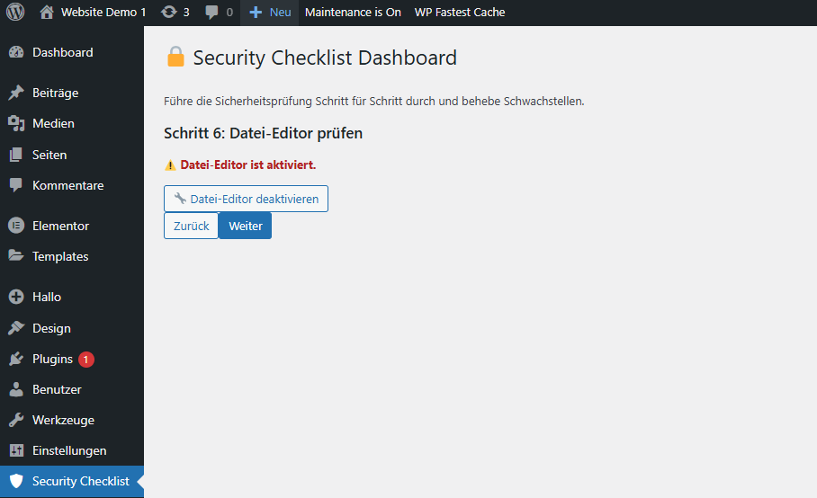 Das Security Checklist Dashboard verändert keine Dateien, Einstellungen oder Datenbanken. Es handelt sich ausschließlich um ein Diagnose- und Informationswerkzeug. Dadurch kannst du es bedenkenlos auf jeder Produktions-Website einsetzen. Wenn ein Problem erkannt wird, erhältst du eine klare Empfehlung, wie du es manuell beheben kannst, zum Beispiel durch Plugin-Einstellungen, serverseitige Anpassungen oder Hosting-Konfigurationen.