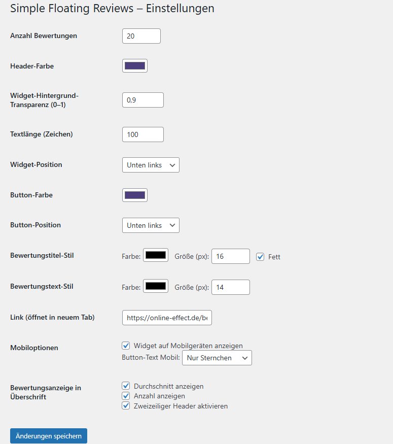 Der Durchschnitt und die Anzahl der Bewertungen (zum Beispiel „4,9 von 5,0 (18)“) werden automatisch berechnet und im Widget angezeigt – optional ein- oder zweizeilig.