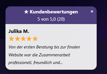Die Bewertungen wechseln automatisch in einem sanft animierten Slider. So bleiben Besucher aufmerksam und sehen mehrere positive Stimmen.