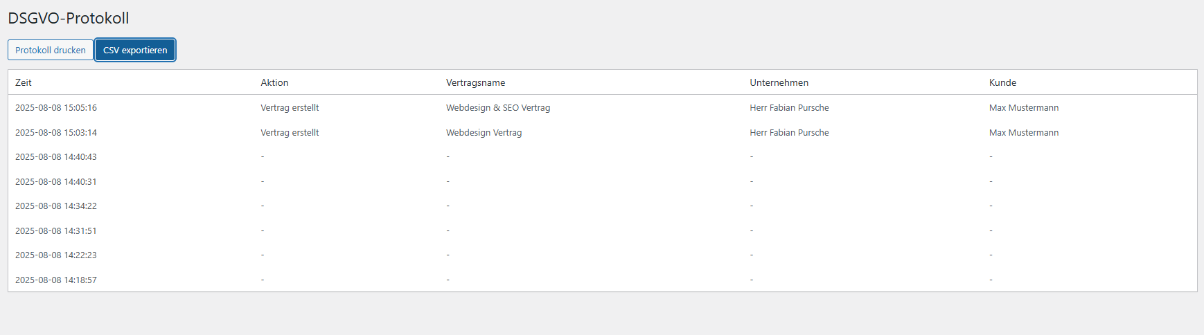 Unser DSGVO-Protokoll sorgt dafür, dass alle wichtigen Aktionen rund um deine Verträge sicher und nachvollziehbar dokumentiert werden – ganz automatisch und DSGVO-konform.