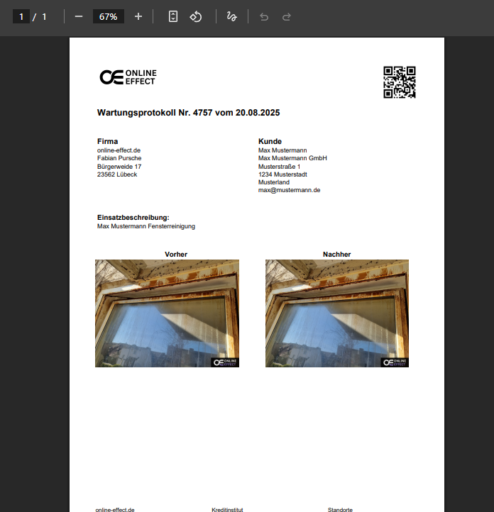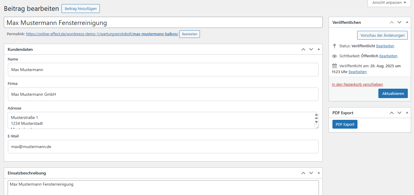 Mit dem Wartungsprotokoll-Plugin dokumentierst Du Deine Arbeit so, wie es Kunden erwarten: sauber, nachvollziehbar und jederzeit exportierbar als PDF.