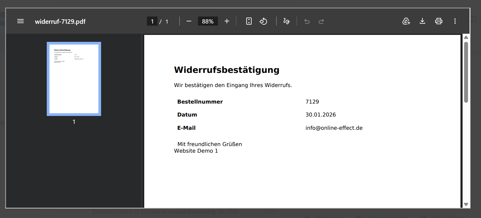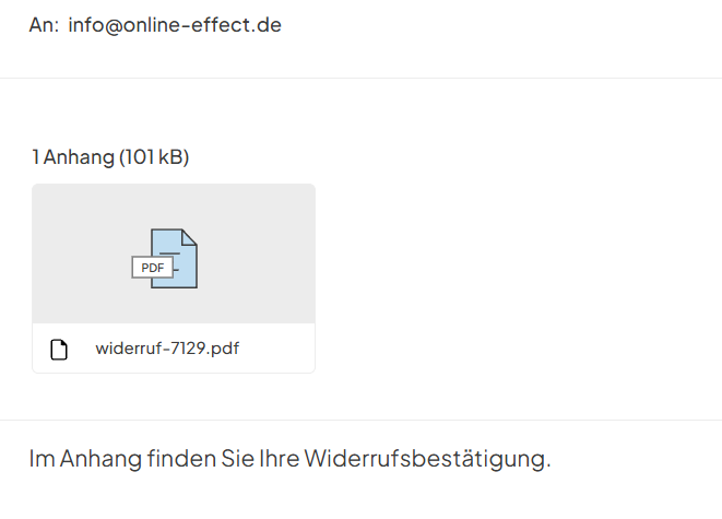 Dein Kunde (im Testdurchlauf bist du das) erhält den Widerruf sofort per E-Mail zugesandt. In dieser E-Mail befindet sich eine PDF-Datei mit der Bestätigung des Widerrufs.