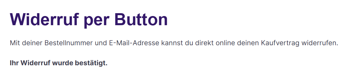 Nachdem du die Daten eingetragen hast, klicke auf den Button „Widerruf absenden“. Sollten Bestellnummer, E-Mail-Adresse und der Zeitraum der Widerrufsfrist passen, erscheint die Meldung „Ihr Widerruf wurde bestätigt“.