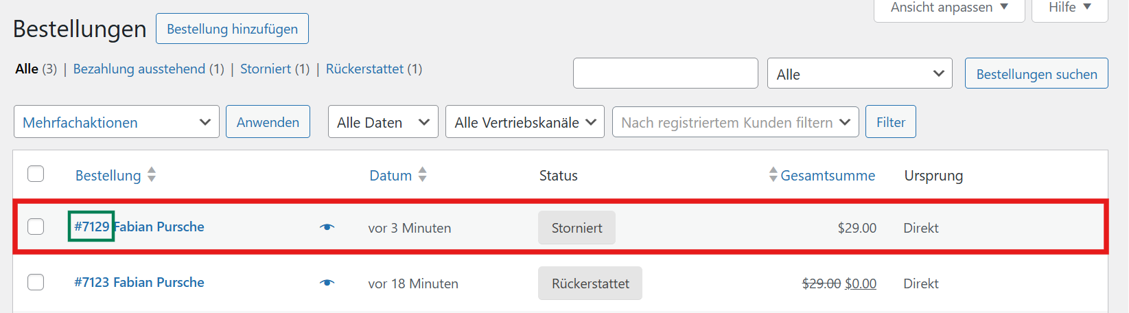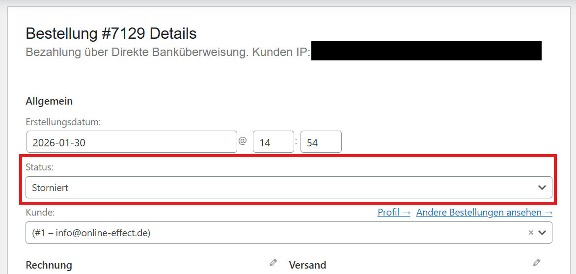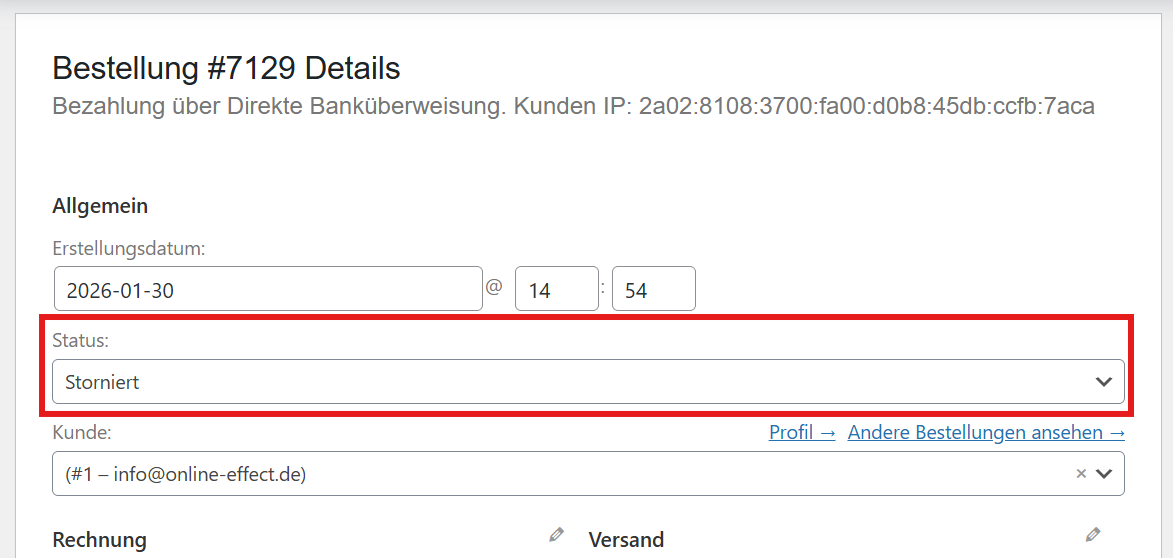 Im Backend siehst du nun, dass der Status der Bestellung zu „Storniert“ geändert wurde.