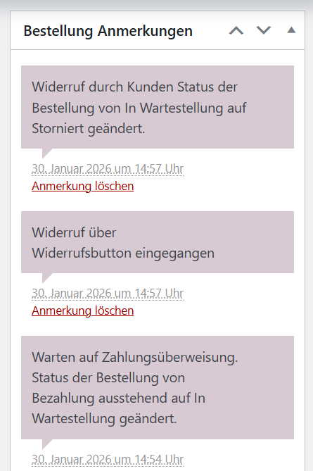 Das Plugin trägt in die Anmerkungen zur Bestellung den Hinweis hinzu, dass die Bestellung per Widerrufsbutton widerrufen wurde.