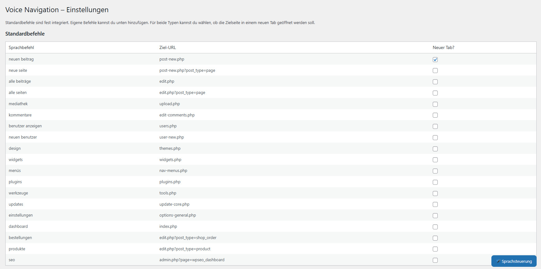 Dieses Plugin verwandelt deine Stimme in das ultimative Navigations-Tool: Einmal aktiviert, erkennt die eingebaute Sprachsteuerung sofort deine Befehle und führt dich direkt an die gewünschte Stelle im Backend. Ob du einen neuen Beitrag erstellen, die Mediathek öffnen oder die Plugin-Übersicht aufrufen möchtest – ein klarer Sprachbefehl genügt.